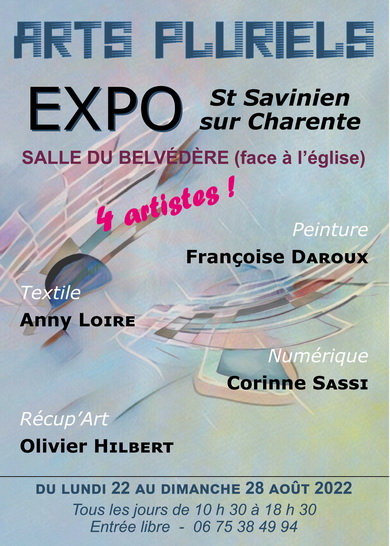 Arts Pluriels Saint Savinien, du 22 au 28 aout 2022Salle du Belvédère Françoise Daroux, Anny Loire, Corinne Sassy et Olivier Hilbert |