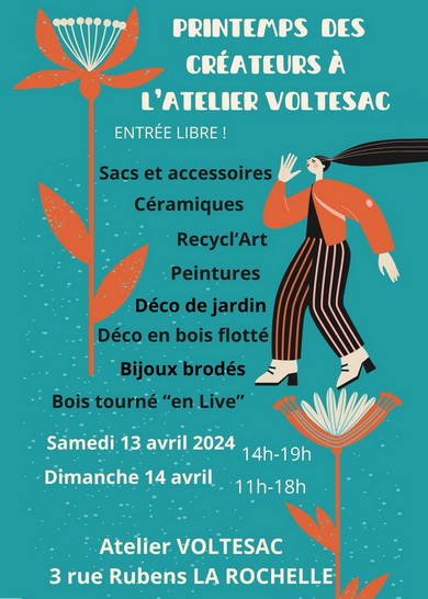 Printemps des Créateurs, à l'atelier VOLTESAC les 13 et 14 avril 20243 rue Rubens, La Rochelle |